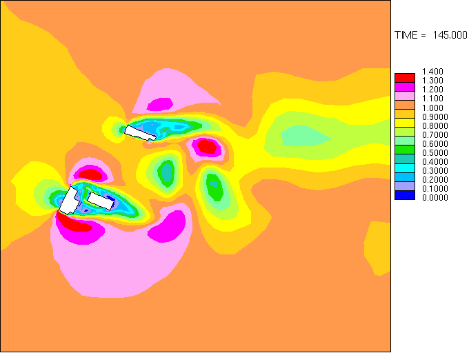 また、この中央部建物の存在により建物群としての抵抗力が増加するため、建物群を迂回する風の流れになる傾向も現われています。