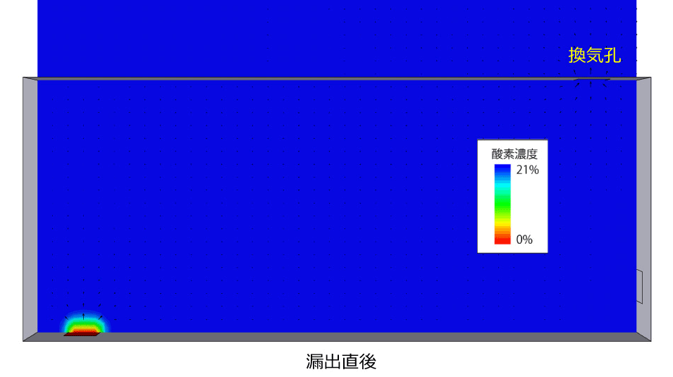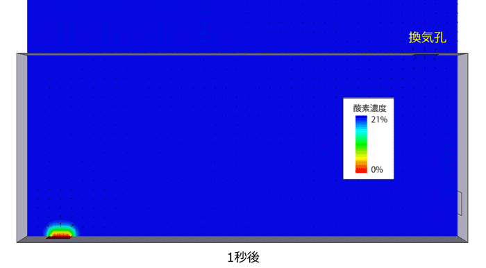 酸欠空気が、短時間、室内に漏出した場合の酸素濃度分布の挙動を予測した事例(換気孔天井部一箇所)